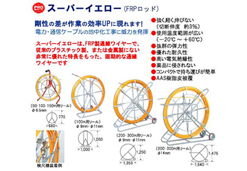 スーパーイエローはFRP製通線ワイヤーで、従来のプラスチック製、または金属製にない非常に優れた特長をもった画期的な通線ワイヤーです。